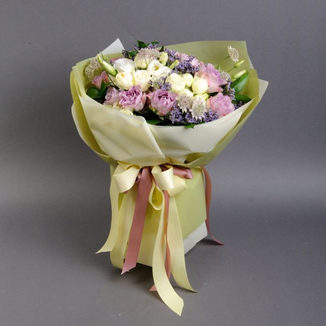 When choosing a bouquet for a significant moment, the "Franzouza" Bouquet from Camellia is an impeccable choice. Crafted using Snow World and Memory Lane spray roses, astrantia, ruscus, eustoma, and limonium, this bouquet impresses with its elegance and stunning beauty.