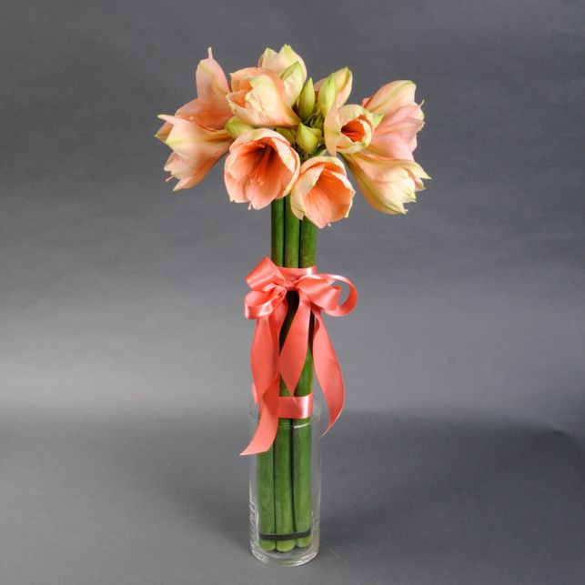 The bouquet features exquisite peach amaryllis, symbolizing purity and tenderness. Each flower is carefully selected, ensuring the highest quality for you.