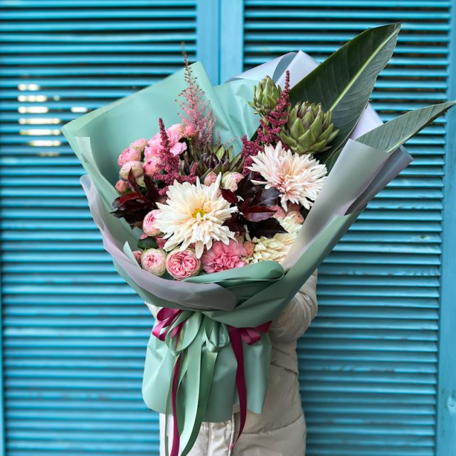 Chrysanthemum, artichoke, astilbe, carnation, Sweet Trendsetter peony-shaped rose, strelitzia leaf, Dutch greenery