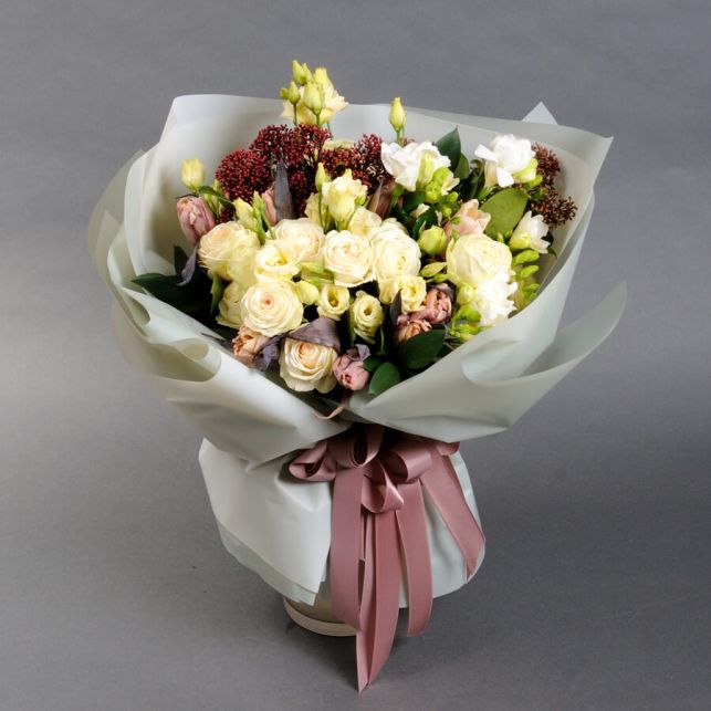 The bouquet includes rose spray Snow World, eustoma, skimmia, freesia, tulip, ruscus