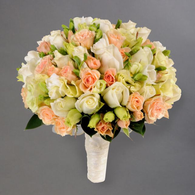 Bridal Bouquet No. 50 from Camellia store is a true embodiment of elegance and tenderness. It consists of roses grown on our own farm, including Avalanche roses and spray roses Elena, which harmoniously blend with freesia and eustoma. This bouquet emphasizes the individuality and character of the bride, complementing her wedding look. Each flower is chosen with special care to give the bouquet sophistication and uniqueness. Purchasing Bridal Bouquet No. 50 at Camellia store, you will receive not only a high-quality product but also impressions that will last a lifetime.