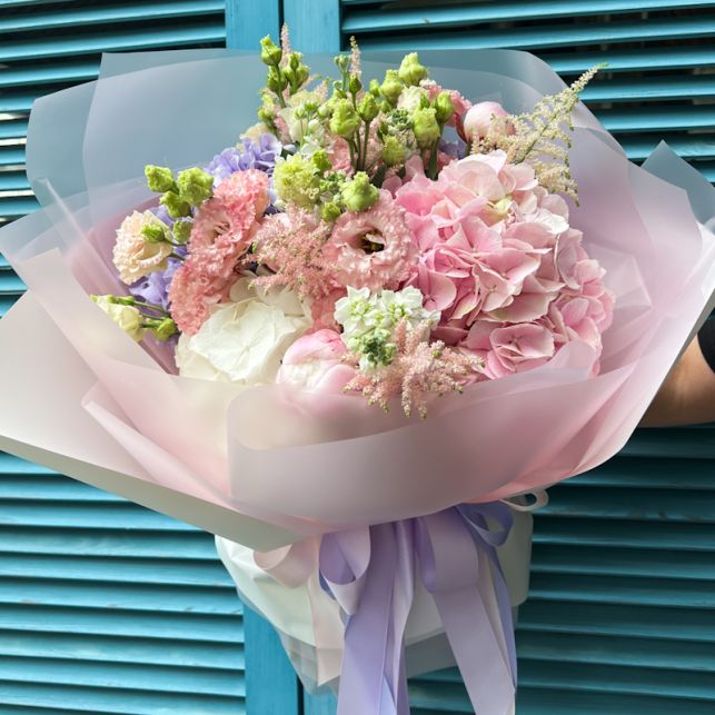 Hydrangea, peony, eustoma, mathiola, astilbe