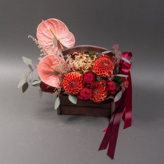 Don't miss the opportunity to make your home even more beautiful and inviting. Purchase the Composition in a wooden vase with dahlias and anthurium at Camellia and enjoy the best quality and the unsurpassed beauty of nature in your home.