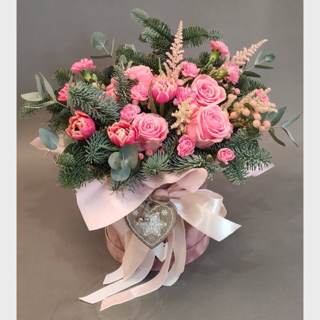 The composition includes pine branches, Sophia Loren rose, eucalyptus, tulip, astilbe, hypericum, carnation, heart pendant