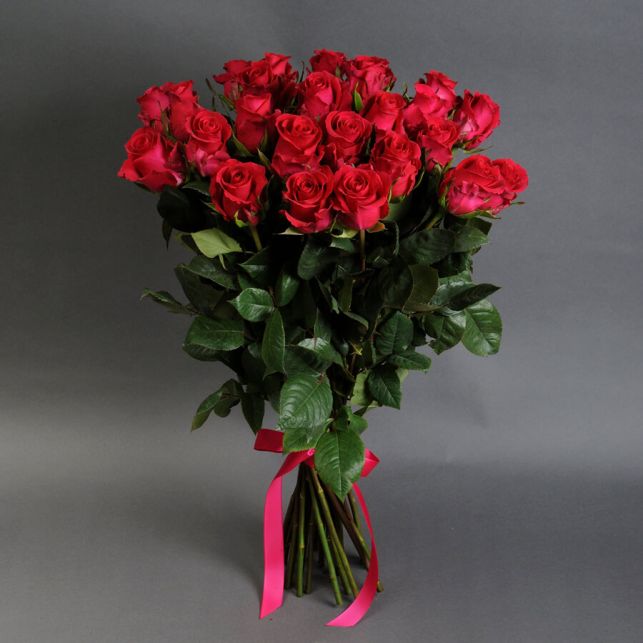 Цветы, вошедшие в этот букет, были отобраны из лучших сортов, а их яркие оттенки впечатляют своей глубиной. Заказав у нас, вы можете быть уверены в изысканности каждого бутона. Большое количество троянд в букете добавляет ему роскоши и поражает огромным количеством цветочных головок.