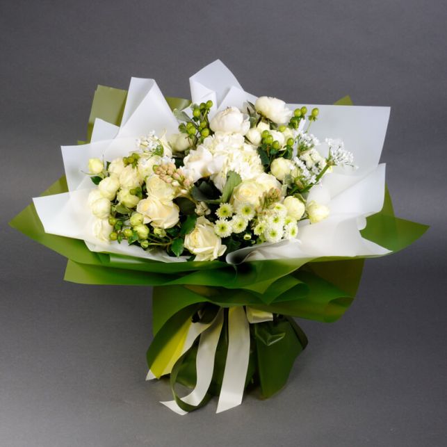 В состав букета входит: пион, гортензия, пионовидная роза спрей Сноу Ворлд, роза Аваланч, хризантема, ягодки хиперикума