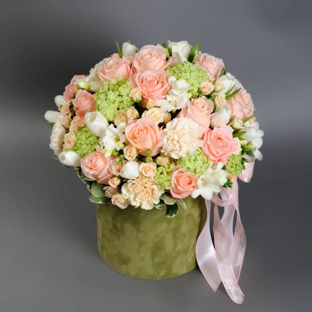 В состав композиции входят: роза импортная, роза спрей Крем Грация, вибурнум, фитоспорум, гвоздика, фрезия, тюльпан