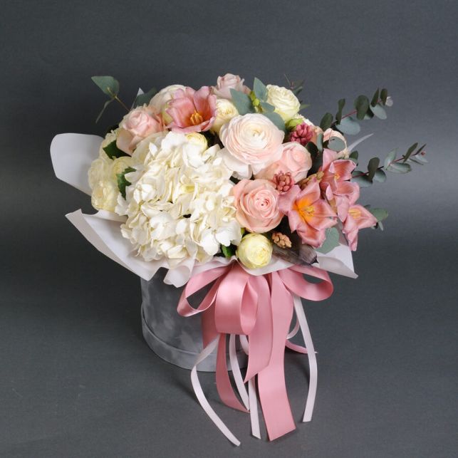 До складу композиції входить: гортензія, ранункулюс, троянда імпортна, гіацинт, тюльпан, евкаліпт, троянда спрей Сноу Ворлд
