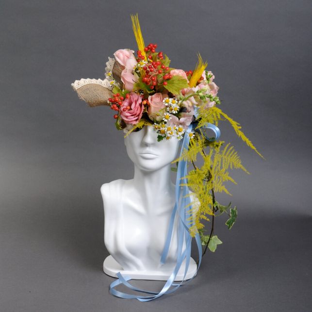 В состав композиции входит: эустома, плюмозус, танацетум, вибурнум, антиринум, импортная роза, колосок