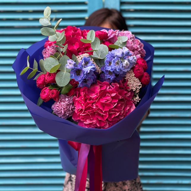 Гортензія, троянда спрей Черрі Трендсеттер, дельфініум, гвоздика, озотамнус, евкаліпт