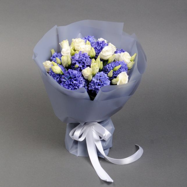 Цей букет - не просто квіти, це витончений акцент для вашого приміщення. Чарівний аромат гіацинтів занурить вас в атмосферу весняної свіжості, а еустома додасть нотку розкіші та вишуканості.