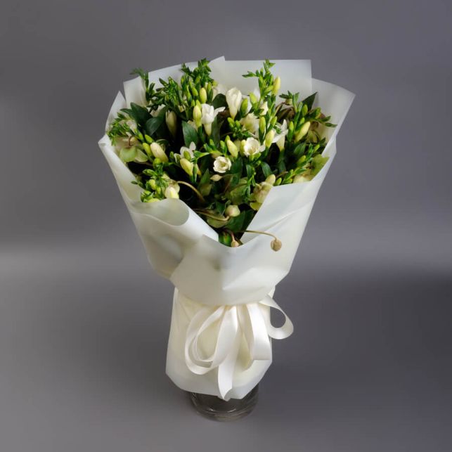Купівля квітів в магазині "Camellia" - це завжди вдалий вибір! Особливо, коли йдеться про букет-комплімент "Фрезія". Цей чарівний букет з фрезією та хелеборусом стане ідеальним подарунком для вашого коханого чи близької людини. Оформлений у дизайнерське пакування, він не лише вражає своєю красою, але і виражає ваші найтепліші почуття.