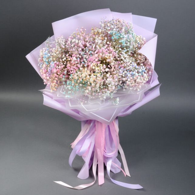 Ласкаво просимо до магазину квітів "Camellia"! Найцікавіший подарунок чекає на вас - це букет мікс гіпсофіл. Цей чарівний комплект складається з 7 кущів гіпсофіли різних кольорів, створюючи неймовірну гру квітів.