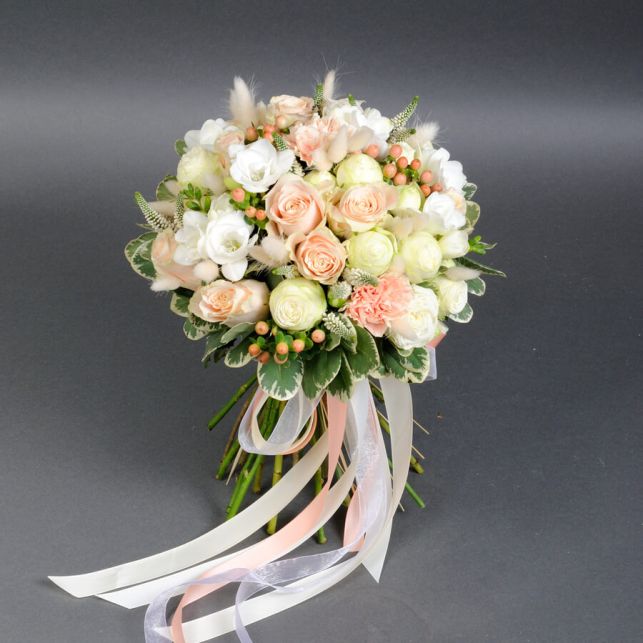 Запрошуємо вас оглянути ексклюзивний весільний букет "Теплі почуття" у магазині Camellia. Цей букет — справжнє втілення ніжності та краси. У ньому поєднані найкращі квіти, які вражають своєю свіжістю та яскравістю. Троянда спрей Сноу Ворлд, хіперікум, вероніка, троянда Шарман, гвоздика, фрезія, лагурус, фітоспорум — кожна рослина додає особливий шарм цьому букету. А стрічки, що доповнюють композицію, надають йому вишуканості та завершеності. Купуючи цей букет у нашому магазині, ви можете бути впевнені в його якості та свіжості. Пориньте у чарівний світ квітів разом з Camellia!