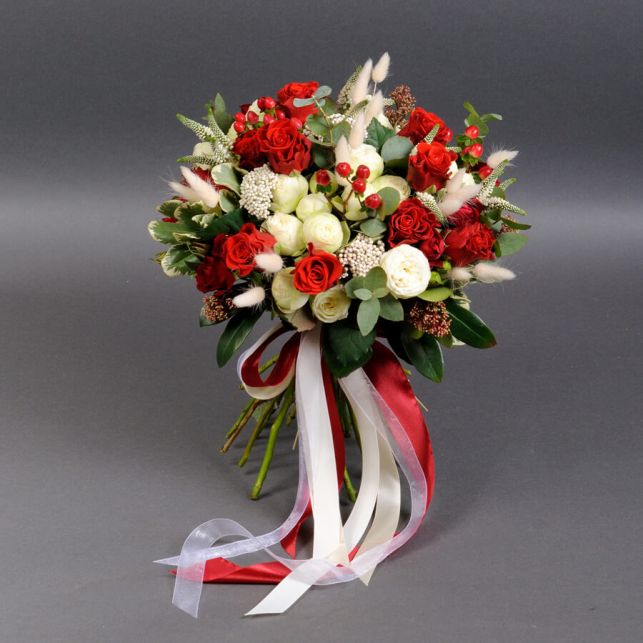 Наш букет складається з троянд спрей Сноу Ворлд та Ред Ванесса, троянди Ель Торо, хіперікуму, евкаліпту, ськиму, озотамнусу, фітоспоруму та лагурусу. Кожен елемент відіграє свою унікальну роль у створенні вишуканого та неповторного образу.