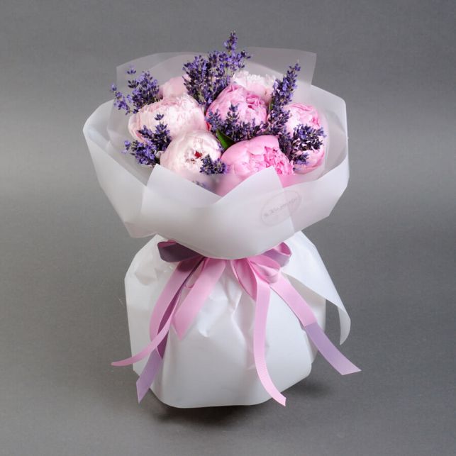 До складу букету входять півонії та лаванда