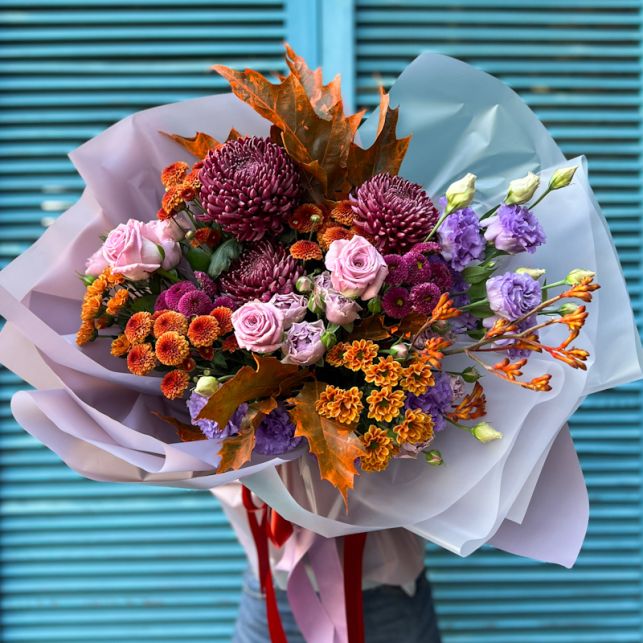 Піоноподібна троянда Лавендер Бабблз, троянда Наелі, хризантема, еустома, куеркус, анігозантос