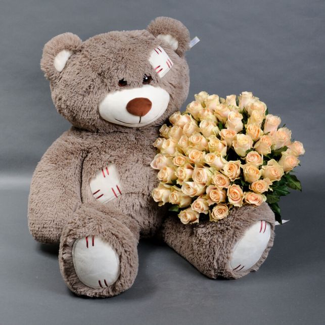 У магазині Camellia ви знайдете неймовірні композиції, що подарують радість та тепло вашим близьким. Одним із найвишуканіших варіантів є букет троянд Шарман та плюшевий ведмідь. Завдяки власному вирощуванню троянд, ми гарантуємо їх вишукану якість та свіжість. 51 кремова троянда сорту Шарман, що входить до складу букету, робить його надзвичайно вишуканим та елегантним. Додатково, плюшевий ведмідь стане прекрасним доповненням до цієї чарівної композиції. Оберіть цей букет для найкращого враження та виразу своєї любові.