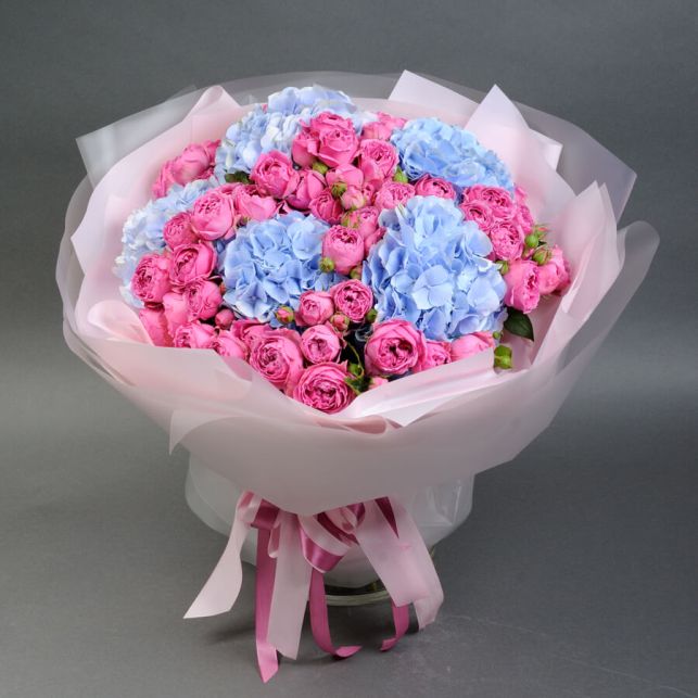 Букет з гортензією і трояндою "Місті Бабблз" від магазину Camellia — це витончена композиція, що надихає своєю красою. Кожна деталь цього букету виражає відчуття тепла і ніжності. Гортензія, яка символізує вдячність та любов, в поєднанні з трояндою, яка вважається символом пристрасті, створюють чарівний ансамбль.