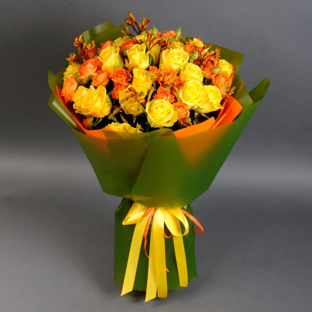 Цей букет - справжнє втілення ніжності та страсті. Троянди Пенні Лейн символізують чисту красу, тепло і любов, тоді як Оранж Фаєр додає елемент екзотики та енергії.