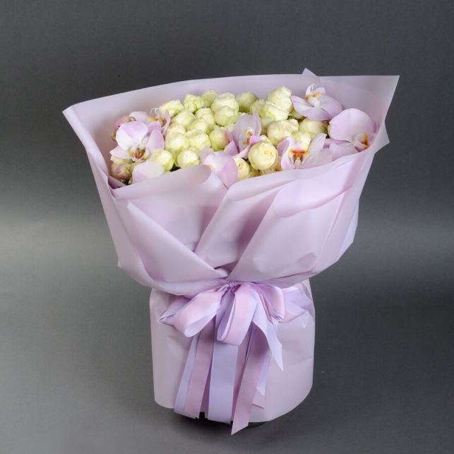 Букет із піоноподібних троянд Сноу Ворлд і орхідей Фаленопсис вражає своєю вишуканістю та неповторною красою. Кожен елемент цього букета вибірково підібраний, щоб створити враження неповторності та витонченості. Купуючи у нас, ви обираєте не лише букет, а й гарантію насолоди від вишуканих квітів.