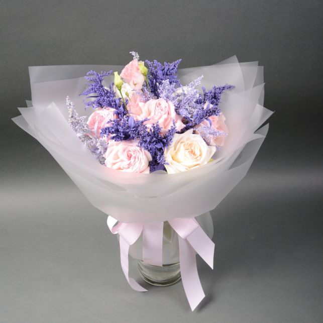 Роза Вайт Охара, троянда Пінк Охара, солідаго фарбований, еустома