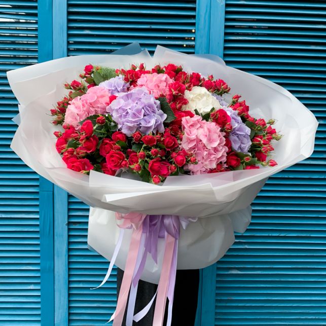 Цей чарівний букет складається з ароматних троянд і ніжних гортензій спрей Алексін. Він ідеально підходить для подарунків на будь-який важливий випадок. Наші квіти завжди свіжі та яскраві, завдяки відбірній якості і дбайливій обробці.
