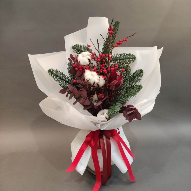 Зимовий букет з натуральними хвойними гілками. Також до складу букету входить: ілекс, нобіліс, леукадендрон, евкаліпт, бавовна