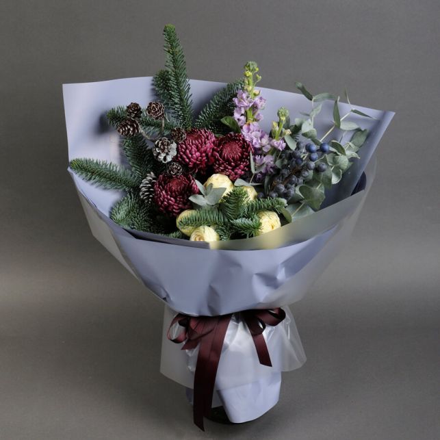 До складу букета входить: гілка лохини штучна, гілка з шишками штучна, нобіліс, троянда спрей Сноу Ворлд, хризантема, матіола, евкаліпт