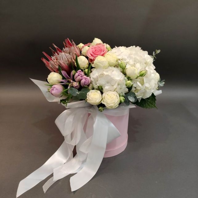 Композиція "Ніжна хмарка" від магазину Camellia - це витончена симфонія кольорів і ароматів, яка неодмінно вразить вас своєю красою. У цьому букеті гортензія, протея, троянди Софі Лорен та Сноу Ворлд, евкаліпт і тюльпан сплітаються в чудовий гармонійний образ. Купуючи цей букет у нашому магазині, ви можете бути впевнені у вишуканості кожної квітки, оскільки ми пильно дбаємо про якість наших продуктів. Дозвольте цій ніжній хмарці занурити вас у світ найкрасивіших емоцій і створити особливу атмосферу в будь-якому приміщенні.