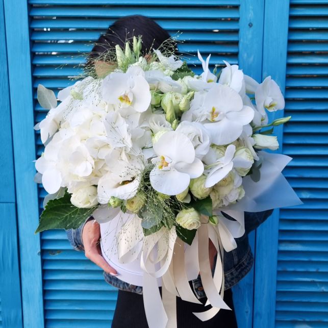 Композиція "Пломбір" від магазину Camellia - це елегантний і надзвичайно ніжний подарунок, який вразить навіть найвибагливіших отримувачів. Вона складається з великої гортензії, чарівних піоноподібних троянд та вишуканої еустоми, що створює враження милого літнього саду. Але особливою прикрасою є квіти орхідеї Фаленопсис, які додають цій композиції витонченості та розкоші. Придбавши цю композицію в магазині Camellia, ви можете бути впевнені у високій якості квітів та професійному підході до їх складання. Зробіть незабутній подарунок своїй коханій людині, обираючи композицію "Пломбір" від Camellia.
