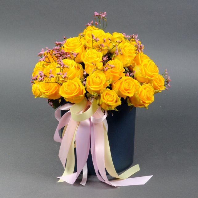 Ласкаво запрошуємо вас до магазину "Camellia" - місця, де краса оживає. Сьогодні ми з радістю представляємо вам нашу композицію з трояндами Пенні Лейн. Ці жовті троянди, прикрашені ніжним фіолетовим лімоніумом, здатні зробити будь-яку обстановку більш привітною та світлою.