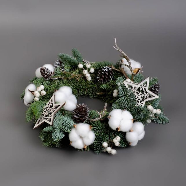 До складу композиції входять ялинка, ялинкові іграшки, бавовна
