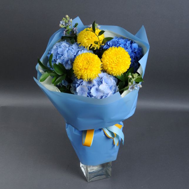 Цей Жовто-блакитний букет вражає своєю красою та гармонією кольорів. Він складається з екзотичних гортензій, зеленого рускусу, яскравих хризантем і ніжних оксіпеталум. Кожен квітковий бутон - це маленьке диво природи, яке ми зберігаємо для вас. Оберіть цей букет для особливого випадку або просто для того, щоб зробити день вашого близького людини яскравішим.